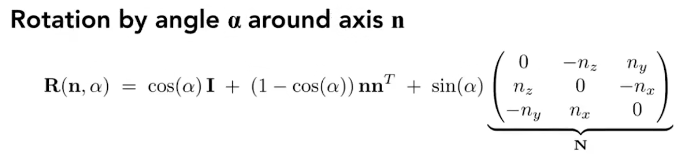 18 Eigen::Matrix3f R = cos(alpha) * I + (1 - cos(alpha)) * nnT + sin(alpha) * N;