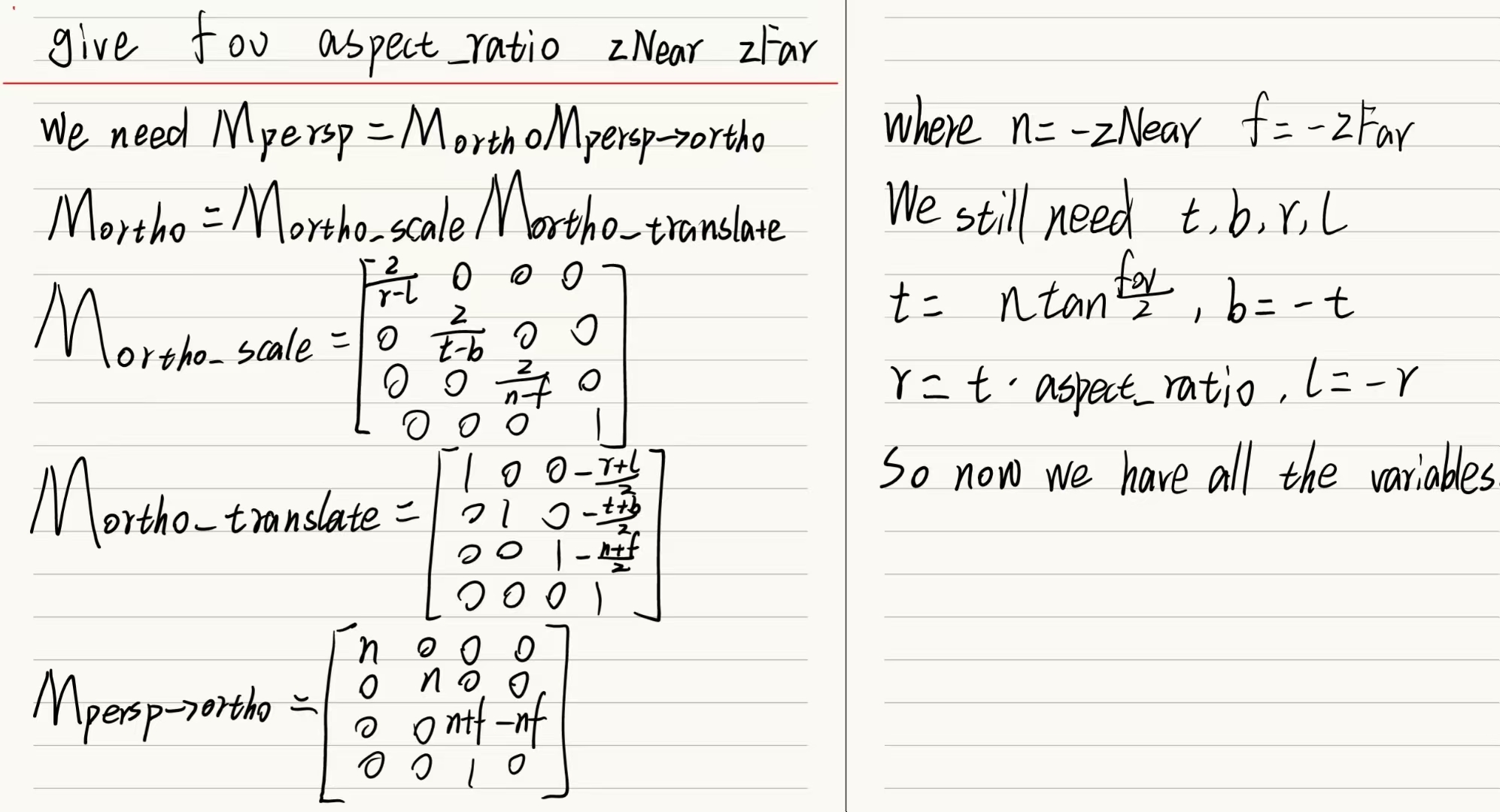 - 使用给定的参数返回一个投影矩阵,结合上节的知识以及这一节开头的知识我们有