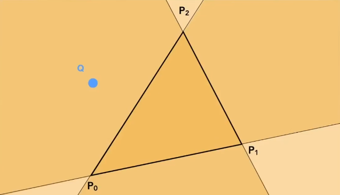 如图:这个点在三角形外部,我们逆时针(顺时针也行)看三角形的边,我们依次计算 - $P_OP_1 \times P_0Q$它的方向是垂直于屏幕指向屏幕外的