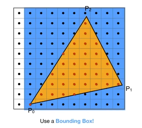 我们之前是使用屏幕上所有的像素对屏幕空间进行采样,不过这是不必要的,如果你的三角形相对于屏幕非常的小,那么这么做非常的浪费时间,实际上我们可以通过三角形的顶点找出这个三角形的Bounding Box(包围盒),来优化这个采样空间,下面图片使用的是AABB包围盒,它被定义为一个矩形,边始终平行于坐标轴