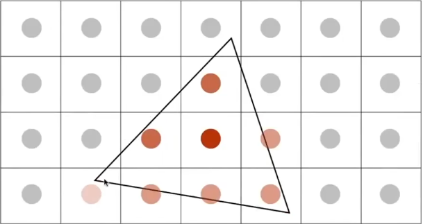 三角形是一种连续的函数,给定任何一个点我们可以测试这个点是否在三角形内部。然后我们可以使用屏幕上的像素的中心点来进行这个测试,最终我们会得到一个类似三角形的图案