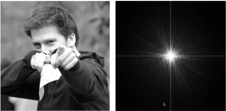 如下图,通过傅里叶变换我们将左边的图像从空域映射到频域,