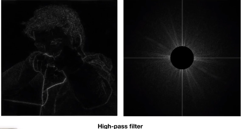 滤波其实就是以某种方式去掉一些频率的信号,如下图我们将低频信号去掉,这叫做高通滤波器,人物的边界与环境的信息通常是高频信息