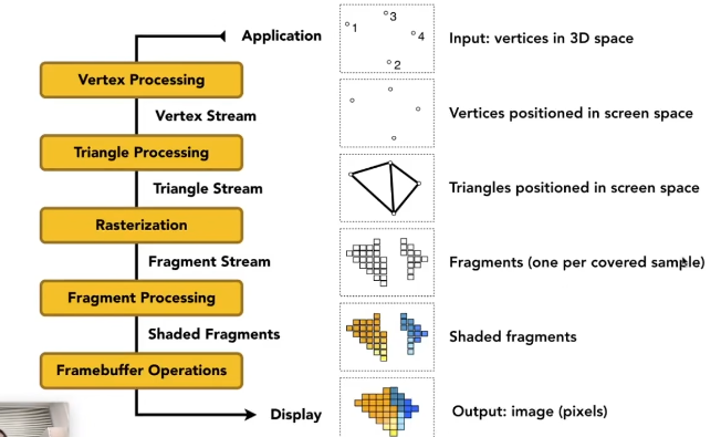 Application inpute vertex data->Vertex Processing->Rasterization->Fragment Processing->Per-Sample Operations->Output