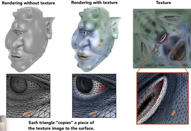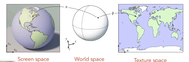 纹理映射 Texture Mapping,我们的物体想要变得更好看还需要使用纹理,也就是游戏中常说的贴图,通过贴图我们可以给一个几何形体的不同位置定义不同的颜色,而这是怎么做到的呢?这就需要使用到纹理映射了。简单来说我们就是通过一种方式将几何体上的点映射到平面图形上的一个点,让几何形体上的点与纹理上的像素建立一个一一对应的关系。