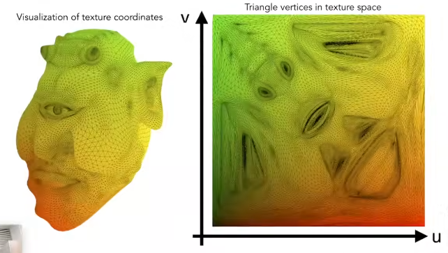 我们知道模型都是由非常多的三角形组成的,所以我们只需要解决三角形的纹理映射纹理就行了。那么我们怎么映射呢?其实很简单我们只需要定义某个三角形三个顶点应该对应纹理空间(图片的二维直角坐标系,图片的左下角位于原点)下的哪些纹理坐标就行了,而对于内部的纹理坐标我们可以进行重心坐标插值得到,而对于三角形顶点的纹理坐标应该是对应纹理的哪里?这是美术师的工作。