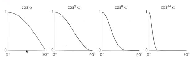 我们仔细观察公式可以看到公式最后还有一个指数 $p$ ,这个指数 $p$ 是用于调整接近程度的, 对于普通的余弦函数的问题它的变化过于平缓,这会导致我们在很多区域都能看到高光,但是我们希望在一个小的区域才有高光,所以我们可以通过这么一个指数 $p$ 来调整余下,让只有非常接近的角度才有高光