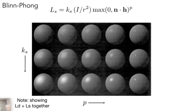 L_s = k_s\frac{I}{r^2} \max(0, \mathbf{n}\cdot \mathbf{l}) \max(0, \mathbf{h} \cdot \mathbf{n})^p