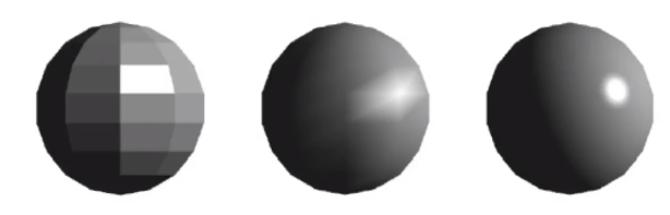 我们可以看到上面三个球,他们的几何模型都是一样的,但是使用了不同的着色方式,