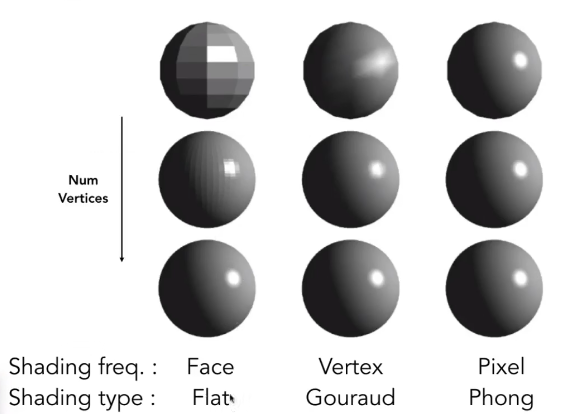第一个是逐面进行着色,第二个是逐顶点进行着色,第三个是逐像素进行着色,可以看到使用不同的着色方式的到的效果大不一样,逐像素的着色效果远远好于前面两个。而对表面进行着色是最简单的因为我们在Bilnn-Phong模型中需要使用到法线,而面大多都是利用法线定义的自带法线,而对顶点进行着色需要我们手动规定这个顶点的法线方向,而对像素进行着色则需要利用三角形顶点的法线对内部的像素进行插值得到内部每个像素的法线。