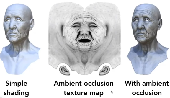 纹理还可以应用到环境光遮蔽上,对于一个模型如果它存在一个凹陷区域,例如人的耳朵内部,我们使用Bilnn-Phong着色的话耳朵内部其实也会被环境光系数的存在照亮,但现实中不是这样的,所以我们需要使用一种环境光遮蔽的方法解决这个问题,而最简单的做法就是使用环境光贴图AO Map来解决了