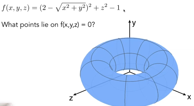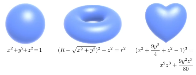 隐式的表示方法就是不会告诉你这些点具体在哪,而是会告诉你这些点满足一个什么样的关系,这通常是我们数学中常用的,例如我们使用代数方程$x^2+y^2+z^2 = 1$表示一个球等等。我们通常可以使用一个方程$f(x,y,z) = 0$表示一个几何形体。