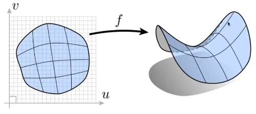 除此之外我们还有一种映射的表示方法,我们先定义好这些点在二维上的位置,然后通过一个函数将这个点映射到三维空间中去。即$f:\mathbb{R}^2\to \mathbb{R}^3;(u,v)\mapsto(x,y,z)$