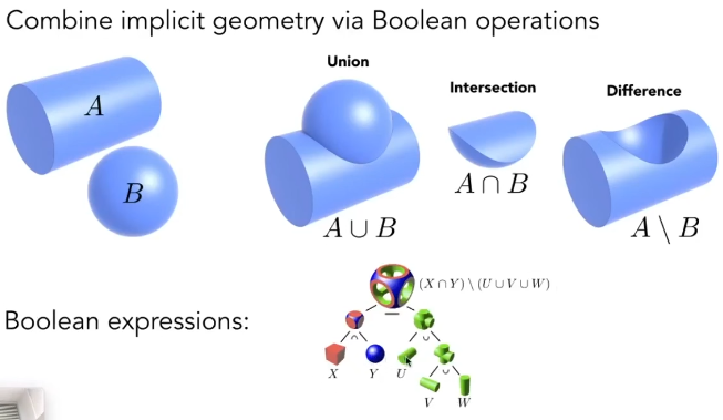 表示复杂的几何非常困难,但是我们可以通过搭积木的方式将不同的简单的几何体组合起来表示复杂的几何。有一种组合方式就是通过几何运算,我们可以把几何看成一系列点的集合,然后我们可以对这些点集进行集合运算