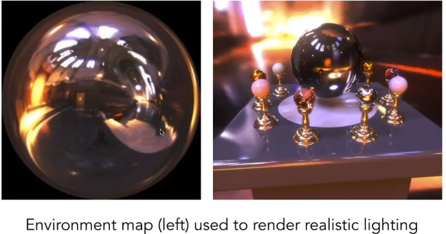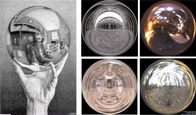 那么我们记录环境光能?我们可以采用这么一种方式:在环境中放置一个非常光滑的镜子球,那么环境光照射到这个球上,如果我们能记录这个球上的光照信息,那么我们不就能记录到环境光了,这个球反射的光就是环境光的信息。而使用球体来记录环境光信息的方式,我们就叫它Spherical Environment Ma。