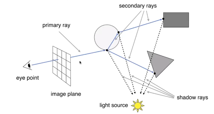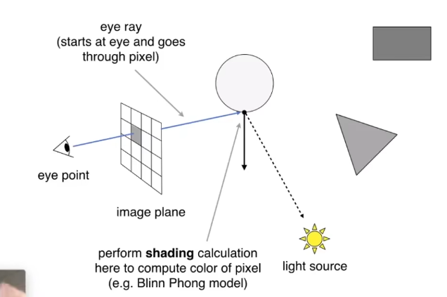 光线追踪大概是这么一个过程:从摄像机(一个点)出发,通过一个显示平面,这个显示平面被分成了许多个像素,每个像素向场景中发射出一条光线(eye ray),如果这个光线与场景中的物体相交了,那么我们就对第一个交点(intersection point)向光源进行连线,如果这个连线没有被其他物体遮挡,那么我们就对这个像素做一个着色。