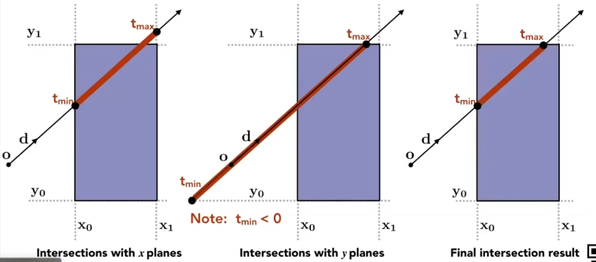 对于二维的情况,我们可以求出一个光线什么时候与x轴平面相交,什么时候与y轴平面相交,而我们可以通过这两个信息求出什么时候光线在AABB内,也就是图中前两个红线的交集,这个思想是当光线最晚与x,y,z轴平面相交的时候,光线就进入了AABB,只要光线第一次与x,y,z轴平面相交的时候,光线就离开了AABB