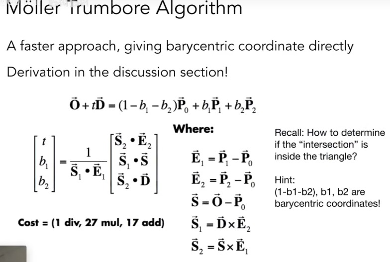 $$t = \frac{(\mathbf{o}-\mathbf{p}^\prime)\cdot\mathbf{N}}{\mathbf{d}\cdot\mathbf{N}}\quad 0\le t < \infty$$当然我们也可以一步到位直接计算光线与三角形面的交点,使用下面的式子就行了