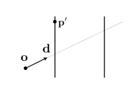 $$(\mathbf{o} + t\mathbf{d}-\mathbf{p}^\prime)\cdot\mathbf{N} = 0$$最终我们得到