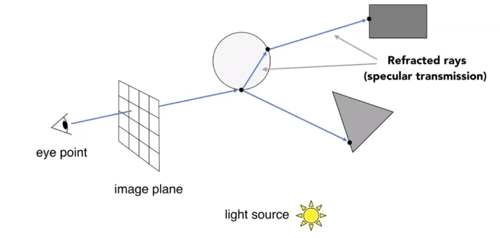 在我们之前的基础上如果我们的 eye ray 第一次与场景中的物体相交,那么会在这个物体上发生反射和折射(如果可以),如果这个反射和折射的光线继续与场景中的物体相交,那么会继续反射和折射,知道这个光线不会与物体相交。可以看到这明显是个递归的算法,我们也可以定义光线最多弹射的次数,以限制无限递归)(因为有可能一个光线在两个物体之间发生无数次弹射)。