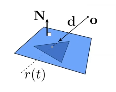 $$t = \frac{(\mathbf{o}-\mathbf{p}^\prime)\cdot\mathbf{N}}{\mathbf{d}\cdot\mathbf{N}}\quad 0\le t < \infty$$当然我们也可以一步到位直接计算光线与三角形面的交点,使用下面的式子就行了