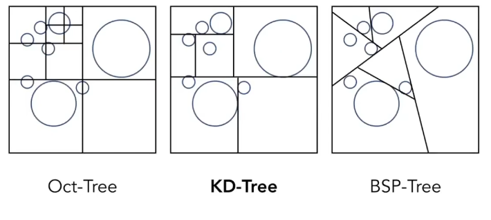 很显然均匀网格法存在问题,所以我们需要改进这个方法,我们想既然均匀网格不好,那么我们可不可以在物体密集的地方使用多的网格,在物体少的地方使用少的网格,这样的技术我们称为空间划分。 下面是三个不同的空间划分的方法