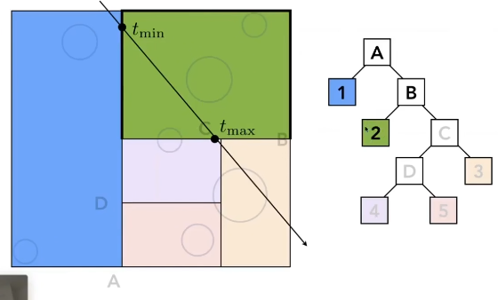 那么这个光线有可能和节点1和节点B相交,我们假设我们最终划分的树就是这样,1是树的叶子节点,那么我们判断1的时候因为它是叶子节点,所以我们需要判断光线与叶子节点中的所有物体是否相交