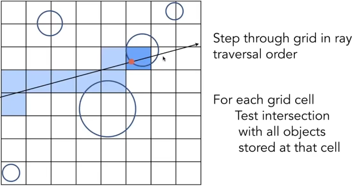 - 开始进行光线与模型求交,光线与物体求交是非常快的,光线与模型求交是非常慢的。我们的光线会与一些格子相交,根据我们上面在网格中存储的信息,如果我们的光线经过了存储物体信息的格子,那么这个光线就有可能与物体相交,此时我们让光线与这个物体求一次交,如果不存在交点就进行下一个格子。