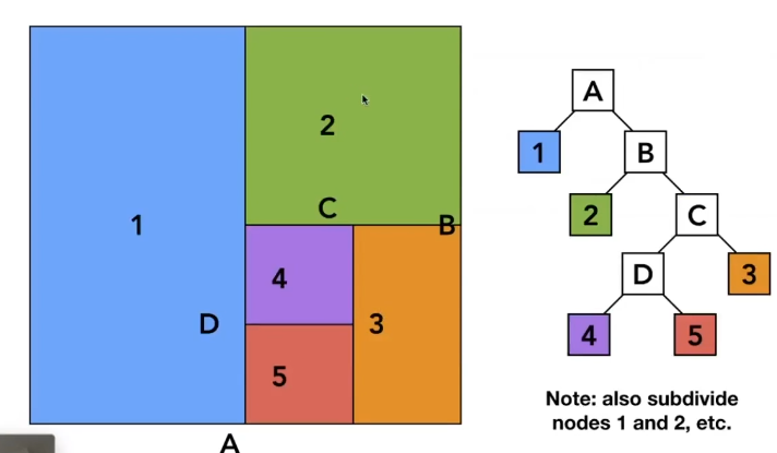 - Oct-Tree 八叉树(二维是四叉树),我们都学过二叉树,那这个方法其实就是类似的,在二维情况下将整个场景使用一个AABB作为根节点,然后在平均分为4个子节点,在子节点中在进行平均划分为4个节点,我们可以定义,如果一个节点中的物体少于n的时候不再进行划分。如图所示,它会存在这种情况:一个物体存在多个节点中